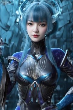 图像中的角色有着长长的蓝色头发和尖角状的耳朵。角色的眼睛很大,表情丰富,目光柔和。他们穿着合身的未来派装甲服,主要是深色,带有金属蓝色和银色的点缀。盔甲上有复杂而流畅的图案,中央有一颗发光的蓝色宝石。人物表情平静,略带自信。背景是模糊的高科技环境,具有各种几何形状和凉爽的蓝色调色板,增强了科幻美感。总体印象是来自未来或奇幻背景的强大、空灵的存在。