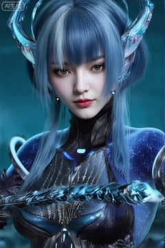 该图像描绘了一个高度细致的未来派角色,拥有银蓝色的长直发。角色的头发在头部两侧设计有两个巨大的、弯曲的、角状的结构,它们是半透明的,具有发光的虹彩品质,呈现出蓝色和粉色的色调。该角色拥有一双富有表情的大眼睛和红唇,与冷色调的头发和服装形成鲜明对比。 该角色穿着合身的高科技套装,主要颜色为深蓝色和黑色,带有复杂的图案和纹理,暗示着先进的材料和技术。该套装具有金属和发光元素,包括发出柔和蓝光的线条和形状,增强了未来主义美感。角色的肩膀上装饰着类似盔甲的镀层,手臂和胸部区域有发光的点缀。 角色的右手拿着一根同样发出明亮蓝光的法杖或武器,与整体配色方案相匹配。背景是青色和蓝色的渐变,具有稍微模糊的效果,可以将焦点保持在角色上。总体印象是一个强大的、超凡脱俗的存在,可能是一个战士或法师,背景设定在科幻小说或奇幻宇宙中。