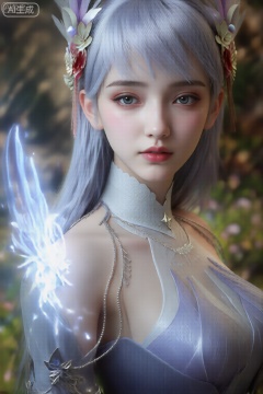 该图像是一个数字渲染角色的特写镜头,有着长长的银色头发和富有表情的大眼睛。她穿着一件高领无袖连衣裙,主要颜色为浅紫色,带有复杂的叶状图案。这件衣服具有透明的水晶质感,在她的左肩附近有一个发光的、空灵的翅膀状物体,散发出明亮的蓝白色光芒。角色的头发上装饰着精致的花朵和金属饰物,她的表情平静而安详。背景模糊,色彩柔和自然,让人联想到有绿色植物和鲜花的户外环境。整体风格细致而梦幻,注重优雅和超凡脱俗。