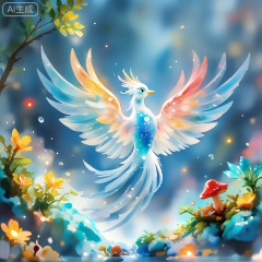 JYZGF, guohuaf, Child Graffiti Painting, mudiaoshanshui, masaikefeng, huoyangxiao, healing children's illustrations, creative animation, FLUX graffiti, magical animation style, a girl pours water by the Crescent Spring, the bottle flow hits the rocks and splashes crystal birds, the water drops fall to the ground and grow a luminous mushroom forest, the ripples reflect the twelve constellations, watercolor style