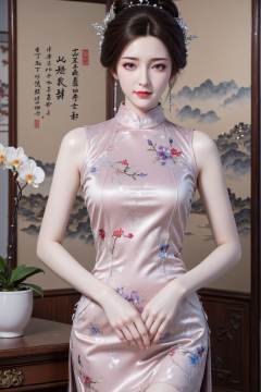 The image features a woman standing indoors against a backdrop that includes a traditional Chinese folding screen and a potted orchid on a wooden table. She is wearing a light pink, sleeveless qipao (cheongsam), a traditional Chinese dress, which is made of a shiny, satin-like fabric. The qipao has a high collar and is adorned with delicate floral embroidery in various colors, including red, purple, and blue, along with intricate silver threadwork. Her hair is styled in an elegant updo, decorated with silver hairpins and floral accessories. She is wearing dangling earrings and has a makeup look that includes red lipstick. Her hands are clasped together in front of her, and she is looking directly at the camera with a soft expression. The background folding screen has a landscape painting with mountains and trees, and there is calligraphy in Chinese characters on the left side of the screen. The overall setting suggests a blend of traditional Chinese aesthetics with a modern touch., high collar cheongsam