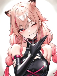 best quality, amazing quality, year 2023, year 2024, ,(((1girl, solo))),Mia,Mia-Starchaser_(Midnight Heist),red eyes,pink hair,light bloden hair,low twintails,cat ears,black bodysuit,black gloves,multicolored hair,<lora:Mia-Starchaser_(Midnight Heist)-noobai_v2.0:0.85>,light smile,grin,upper body, finger gun,one eye closed,pointing forward,head tilt,looking at viewer, white background, sunlight, darkness, vignetting,hatching (texture),close-up,smile, feet out of frame, lens flare,backlighting,portrait,,best quality,amazing quality,very aesthetic,absurdres,masterpiece,best quality,amazing quality,very aesthetic,absurdres,masterpiece,