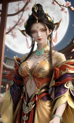 <lora:永劫无间-南宫锦-华锦Pony:0.8>,1girl,black hair,long hair,hair bun,hair bun,golden ornaments,braids,high collar,breasts,jewelry,dress,golden footwear,bare legs,clothing cutout,earrings,bracelet,chinese clothes,, masterpiece,best quality,solo,1girl,upper body,petals,looking at viewer,moon,branch,cherry blossoms,flower,extreme aesthetic,(quasarcake:0.7),masterpiece,best quality,good quality,newest,very aesthetic,absurdres,A shot with tension,(Visual impact,giving the poster a dynamic and visually striking appearance:1.2),impactful picture,offcial art,colorful,splash of color,movie perspective,