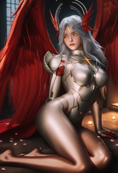 masterpiece,best quality,amazing quality,very aesthetic,high resolution,ultra-detailed,absurdres,scenery,photorealistic,(looking at viewer:1.1),(Dark room:1.3),(moody lighting:1.1),peach blossom,falling petals,(large breasts:0.8),xinghuanwang,1girl,solo,long hair,lips,grey hair,yellow eyes,armor,hair ornament,forehead mark,bodysuit,glowing eyes,shoulder armor,circlet,freckles,headgear,orange eyes,head wings,horns,breastplate,pauldrons,colored sclera,wings,red wings,feathered wings,feet BREAK photorealistic details,<lora:QQSillxinghuanwangV1:0.8>,