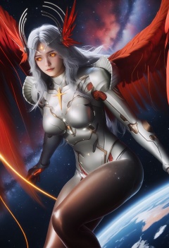 masterpiece,best quality,amazing quality,very aesthetic,high resolution,ultra-detailed,absurdres,scenery,photorealistic,(looking at viewer:1.1),(space:1.2),(universe:1.3),(starry_sky:1.1),(milky way:1.2),(nebula:1.4),starlight,(planets:1.2),rays,(large breasts:0.8),xinghuanwang,1girl,solo,long hair,lips,grey hair,yellow eyes,armor,hair ornament,forehead mark,bodysuit,glowing eyes,shoulder armor,circlet,freckles,headgear,orange eyes,head wings,horns,breastplate,pauldrons,colored sclera,wings,red wings,feathered wings,feet BREAK photorealistic details,<lora:QQSillxinghuanwangV1:0.8>,