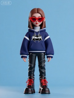 CWIP,这是一幅风格化且3D 渲染效果极佳的人物雕像图像。角色看起来充满朝气,留着棕色的齐肩直发,发尾微微内扣。他们戴着一副红色的时尚墨镜,镜片闪烁着神秘的光泽。服装方面,角色穿着一件深蓝色的连帽卫衣,帽子边缘和袖口处有白色的条纹装饰,胸前印着一个夸张的摇滚乐队标志。卫衣里面搭配了一件浅灰色的高领打底衫。下身穿着一条黑色的紧身皮裤,裤子的膝盖和大腿部位有银色的铆钉装饰,显得个性十足。脚上是一双黑色的高帮马丁靴,鞋带是醒目的红色。背景是纯净的淡蓝色,突出人物主体。
