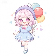 KTXR,该图像描绘了一个动漫风格的角色,有着淡粉色的齐肩短发和粉紫色的大眼睛,瞳孔中有旋转的爱心图案。该角色戴着一顶淡紫色贝雷帽,帽子上别着一支白色羽毛。角色微微仰头,张开嘴露出灿烂笑容。她穿着一件淡蓝色的泡泡袖连衣裙,裙摆是层层叠叠的蛋糕裙样式,上面点缀着白色的小珍珠。这件衣服设计简约,领口处有一个粉色蝴蝶结。该角色还穿着白色短袜和淡蓝色玛丽珍鞋,鞋面上有小珍珠装饰。她手里拿着一束五颜六色的气球,气球有红色、黄色、蓝色等。背景是纯白色的,人物周围散布着彩色的小爱心形闪光,颜色有粉色、浅紫、浅蓝等。整体风格可爱甜美,夸张的大眼睛和小身材,强调角色天真烂漫的样子。
