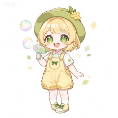 KTXR,该图像展现了一个动漫风格的角色,有着淡黄色的短发和草绿色的大眼睛,瞳孔中有旋转的树叶图案。该角色戴着一顶绿色的宽边草帽,帽子上别着一支黄色的小花。角色咧着嘴,露出开心的笑容。她穿着一件浅黄色的连体背带裤,搭配白色的短袖衬衫,衬衫上有绿色的小叶子图案。这件衣服设计简约,背带裤的口袋上有一个绿色的小蝴蝶结。该角色还穿着白色短袜和浅黄色帆布鞋,帆布鞋上有绿色的鞋带。她手里拿着一把透明的泡泡枪,正在吹出五颜六色的泡泡。背景是纯白色的,人物周围散布着彩色的小树叶形闪光,颜色有淡黄、草绿、浅绿等。整体风格可爱清新,夸张的大眼睛和小身材,强调角色活泼好动的模样。