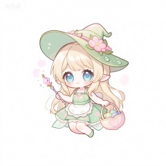 KTXR,描绘了一个梦幻精灵风格的女角色,有着如瀑布般垂落的淡金色长发和如湖水般清澈的蓝色大眼睛。这个角色戴着一顶造型独特的精灵帽,帽子是浅绿色的,帽檐上装饰着粉色的花朵和闪烁的露珠,帽顶有一个小巧的粉色蝴蝶结。角色的服装包括带有粉色小花图案的浅绿色连衣裙,裙摆轻盈飘逸,搭配着一条白色的蕾丝围裙。这个角色一手拿着一根顶端镶嵌着粉色水晶的魔法棒,另一只手提着一个淡粉色心形的小篮子,里面装满了散发着微光的彩色小石头。角色呈坐姿,双腿弯曲,双手分别拿着物品置于身前,角色头部附近有淡粉色的小光晕。整体风格可爱又灵动。