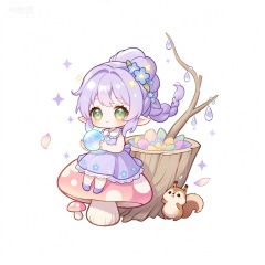 该图像描绘了一个梦幻森林风格的小女精灵角色,淡紫色的头发编成一条松散的大辫子,辫子上缠绕着星星形状的蓝色小花和闪烁的萤火虫装饰。她有一双如湖水般清澈的绿色大眼睛,眼眸中带着淡淡的金色光晕,身着一件带有蓝色小花图案、领口镶着白色蕾丝边的淡紫色连衣裙。她正俏皮地坐在一朵巨大的粉色蘑菇上,手里捧着一个散发着柔和光芒的蓝色水晶球。她的身后是一个巨大的树桩形状的容器,里面装满了五彩斑斓的花瓣,一根细长的树枝从树桩中伸出,上面挂着几颗晶莹剔透的露珠。周围漂浮着几片轻盈的花瓣,一只毛茸茸、有着圆滚滚身体和短小四肢,像小松鼠一样的小生物从树桩后面好奇地探出头来。背景是纯净的白色,淡紫色的小星星和闪烁的星光随意地散布在各处,营造出可爱又充满幻想的氛围。