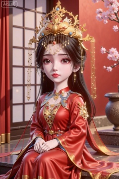 chibi, cute, little girl, (full body:1.3),dressed in a red silk dress, adorned with a gold crown, is seated on a step in front of a window. The little girl's dress is adorned with gold accents, adding a touch of sparkle to her outfit. Her hair is styled in a sleek bob, and her eyes are a piercing blue. The backdrop is a vibrant red, with cherry blossoms adding a pop of color to the scene.