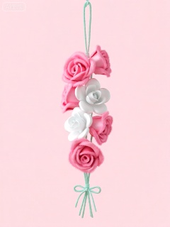 3DYS,该图像呈现了纯浅粉色背景下的一串花朵挂饰。有多个粉色的玫瑰形花朵,它们好似是由带有细腻绒毛的丝绸面料制成,呈现出柔软的质感。粉色玫瑰花朵中穿插着三个白色的花朵,形状像云朵,增添了几分轻盈感。白色花朵也有着丝滑的质感,与粉色玫瑰花朵的风格相协调。所有的花朵都用浅绿色的细麻绳串在一起,这些细麻绳汇聚在花朵串下方的一个点上,并用一个浅绿色的小蝴蝶结扎紧。整体布局和谐且居中,营造出浪漫且温馨的展示效果。