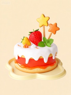 3DYS,该图像描绘了一个心形的双层饼干塔,底部是淡黄色,下层涂抹着细腻的橙色果酱。上层饰有厚厚的白色巧克力涂层边框,边缘有自然流淌的痕迹,露出下面鲜艳的红色果酱层。饼干塔顶面的中心摆放着一颗大大的红色草莓,周围是几颗小巧的、半熟状态的黄色草莓。红色草莓的右边,饼干塔上插着两根星星形状的饼干棒;一个是黄色的,另一个是橙色的。此外,草莓和饼干棒附近还装饰着几片嫩绿的薄荷叶。饼干塔上还点缀着一小团白色和橙色的糖霜。整个饼干塔放置在心形、淡黄色的饼干托盘上,背景是柔和的浅黄色,让整体场景呈现出一种活泼、温馨的感觉。