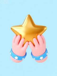 3DYS,该图像的特点是两只可爱风格的手捧着一颗巨大且闪耀的金色星星。星星有着细腻的金属质感表面,能够反射光线,形成耀眼的高光。双手肤色粉嫩,手指小巧且圆润,指甲圆润光滑。每只手都戴着比手腕略宽的蓝色手环,手环上还有白色的小星星装饰。背景是纯净的浅蓝色,与金色的星星和蓝色手环形成清新且柔和的对比。图像的整体风格活泼而童趣,线条简洁流畅,以星星为中心元素。