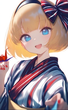 masterpiece,absurdres,best quality,loli,petite,high quality,chromatic_aberration,//,origami,1girl,paper crane,japanese clothes,blonde hair,blue eyes,short hair,solo,kimono,smile,open mouth,hairband,nail polish,hair bow,vertical-striped kimono,striped kimono,bow,sash,bob cut,yukata,white background,upper body,striped bow,obi,simple background,looking at viewer,striped clothes,striped ribbon,holding,red nails,:d,ribbo,//,//,<lora:MAQ1109——【noob】hans:1>,