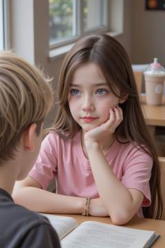 A girl with long brown hair and blue eyes is sitting at a table. She is wearing a pink shirt and has her hand on her chin. A boy with blonde hair is sitting in front of her. There is a book and a drink on the table.