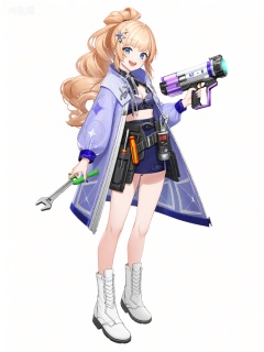 EYLH,该图像的特点是动漫风格的角色,长而卷的金色头发束成高马尾,点缀着星星形状的发饰。她有一双湛蓝的眼睛,脸上洋溢着灿烂的笑容。她的着装巧妙融合了复古与未来元素:她身着带有蓝色滚边和星月图案的淡紫色复古风长外套,搭配饰有白色和银色线条与几何图形的深蓝色短裙。她的腰间系着一条多功能战术腰带,里面收纳着各类工具,有一把螺丝刀和一个小型激光仪。她的右手握着一把造型科幻的激光焊枪,枪身有着紫色和银色的条纹,标有“SF - 09”。她的左手拿着一把绿柄的万能扳手。她穿着未来感十足的白色高帮运动靴。整体美学将复古欧式服装与未来科技、工具实用主题完美结合。
