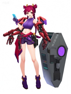 EYLH,该图像刻画了一个动漫风格的角色,玫红色短发编成两条俏皮的辫子,用金色发饰固定。她有一双深邃、坚定的眼睛和爽朗、热情的笑容。她的着装是一件贴身的紫色无袖上衣,下穿紫色短裤。她的腰间束着一条红紫相间的战术腰带,上面挂着各种装备和用品,包括她右手上的一个蓝色小工具。她的腰上搭着一块红紫相间的布,可能是腰带的配饰或是制服的标识,她还戴着紫色手套和带有金色点缀的坚固紫色短靴。她身上装有一条红色和紫色的大型机械外骨骼肩部装置,布满了复杂的线路和橙色的机械臂。该装置连接到一个大型、六边形、灰色的机械模块,该模块位于图像右侧的她附近。机械模块有各种显示屏、开关和一个紫色的圆形部件,它似乎是某种数据处理或控制核心。整体美学是未来科技与战斗风格的结合,突出功能性和战斗准备。这个角色散发着自信和战斗的决心,有力的姿态暗示着力量与果敢。