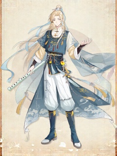 GFLH,该图像呈现了一个动漫风格的角色,如瀑的浅金色长发用淡蓝色丝带挽在脑后。角色穿着精致且独特的服装,将传统与奇幻风格完美交融。上衣是一件靛青色短褂,上面有着精美的鹅黄与朱红刺绣,装饰着流苏和小颗黄宝石等元素。角色内搭一件象牙白交领中衣,袖口微微露出。服装下半部分是白色灯笼裤,脚上是一双靛青色长靴,靴子带有鹅黄镶边与银色链条装饰。角色身着一件飘逸的靛青色大氅,设计飘逸灵动,绣有更多鹅黄与朱红纹路,底部镶嵌着一颗突出的黄宝石。大氅下摆还绘有类似祥云的图案。角色右手持着一支玉笛,笛身泛着温润光泽,似有灵力流转;左手轻抬,人物表情淡然、宁静。背景是简洁的白色,干净纯粹,凸显角色气质。