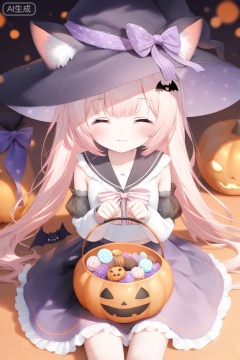 1girl, solo, witch hat, shirt, hat, animal ears, white shirt, closed eyes, facing viewer, pink hair, bow, skirt, hair ornament, twintails, blush, closed mouth, polka dot scrunchie, long sleeves, cat ears, smile, halloween bucket, animal ear fluff, frilled skirt, halloween, good shade, long hair, ^ ^, bangs, pink bow, holding, bat hair ornament, black skirt, striped, striped bow, frills, sleeveless, polka dot, food, very long hair, black headwear, polka dot bow, hands up, sleeves past wrists, black bow, detached sleeves, purple bow, purple skirt, cat girl, hat bow, black sailor collar