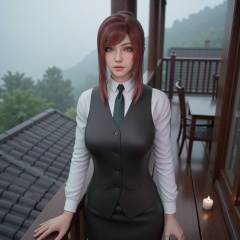 rainy,mimi,ChengSisi,mimi,reddish-brown hair in an intricate high bun,vibrant teal eyes,wearing a white collared shirt,dark grey vest with decorative buttons,and dark green tie,upper body portrait,standing on a wooden porch in rural China,soft rain falling,misty mountain view in the distance,warm tea lights glowing at her feet,ethereal trees shrouded in fog,vernacular architecture with tiled roofs in the background,soggy atmosphere,travel mood,32K UHD,highly detailed,cinematic mist,soft ambient lighting,masterpiece,rainy,slippery mountain scenery,a mountain view with tea lights on the porch,in the style of rural china,ethereal trees,32k uhd,soggy,travel,mist,vernacular architecture,
