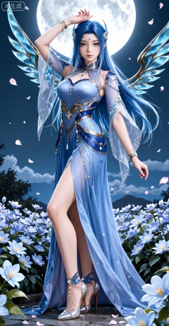 1girl,flower,solo,moon,petals,falling petals,night,hair ornament,high heels,full moon,arm up,dress,from_side