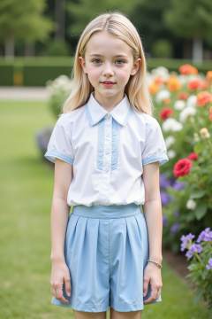 The image is a high-resolution photograph the subject is a young cute girl with blue eyes and blonde hair and fair skin. She has a slender physique and is wearing a traditional clothes, short-sleeved blouse with a collar and a light blue short pleated skirt and eaching just above her knees. The young cute girl expression is neutral, with a slight smile, and she is looking directly at the camera. Her makeup is subtle, featuring light eyeshadow, mascara, and pink lipstick. She has a delicate bracelet on her right wrist. The background is on the grass in the park, with a lot of colorful flowers blooming next to it.