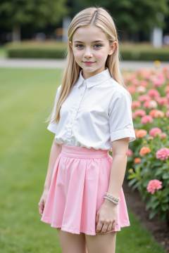 The image is a high-resolution photograph the subject is a young cute girl with blue eyes and blonde hair and fair skin. She has a slender physique and is wearing a traditional clothes, short-sleeved blouse with a collar and a pink short pleated skirt and eaching just above her knees. The young cute girl expression is neutral, with a slight smile, and she is looking directly at the camera. Her makeup is subtle, featuring light eyeshadow, mascara, and pink lipstick. She has a delicate bracelet on her right wrist. The background is on the grass in the park, with a lot of colorful flowers blooming next to it.