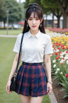 The image is a high-resolution photograph the subject is a young cute girl with fair skin, straight black hair styled in a high ponytail framing her face. She has a slender physique and is wearing a traditional clothes, short-sleeved blouse with a collar and a blue pleated skirt with a red plaid pattern. Her skirt is short, reaching just above her knees, and she carries a black leather handbag on her left shoulder.The woman's expression is neutral, with a slight smile, and she is looking directly at the camera. Her makeup is subtle, featuring light eyeshadow, mascara, and pink lipstick. She has a delicate bracelet on her right wrist.The background is on the grass in the park, with a lot of colorful flowers blooming next to it. <lora:20251105A_AgainGirlF1Lora10:1>