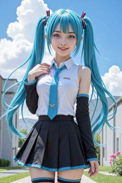 HDR photo of cinematic film still, realistic, photorealistic, 1girl, solo, long hair, breasts, looking at viewer, smile, bangs, blue eyes, skirt, shirt, thighhighs, long sleeves, bare shoulders, twintails, very long hair, blue hair, standing, white shirt, flower, cowboy shot, pleated skirt, outdoors, parted lips, detached sleeves, necktie, sky, sleeveless, day, collared shirt, black thighhighs, cloud, hand up, black skirt, blue sky, lips, zettai ryouiki, sleeveless shirt, aqua hair, skindentation, grass, building, blue necktie, black sleeves, hatsune miku,