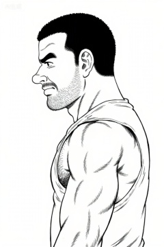 This is a cartoon depicting a muscular man with short hair, dark hair, and beard, presented from the side. His expression is serious and tense, with his mouth slightly open and his eyes focused on the left side; The body muscles have distinct lines, and fine shadows strengthen the muscle contours of the chest and arms. Wearing a sleeveless shirt, the overall style adopts typical tough guy comic techniques, highlighting the sense of strength with fine lines and light and shadow, conveying the character's resolute or alert temperament. This is commonly seen in male oriented movements and strength themed creations.
