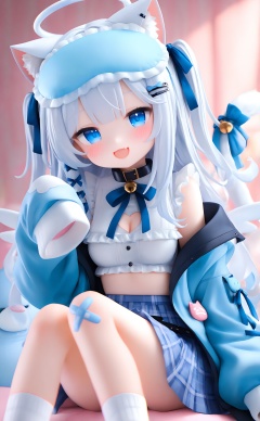 masterpiece,highres,absurdres,newest,best quality,high quality,loli,petite,chromatic_aberration,//,1girl,cleavage_cutout,animal_ears,clothing_cutout,tail,breasts,skirt,cat_ears,blue_jacket,blue_eyes,cat_tail,jacket,cleavage,solo,halo,sleep_mask,blue_skirt,shirt,sleeves_past_wrists,cat_girl,wing_hair_ornament,plaid,bandaid,white_shirt,heart_cutout,plaid_skirt,looking_at_viewer,white_hair,wings,long_hair,open_jacket,bandaid_on_leg,sleeves_past_fingers,virtual_youtuber,frills,socks,detached_wings,pleated_skirt,fang,tail_ornament,hair_ornament,crop_top,open_clothes,two_side_up,medium_breasts,ribbon,animal_ear_fluff,long_sleeves,open_mouth,tail_ribbon,hairband,mini_wings,off_shoulder,smile,sleeveless_shirt,blue_ribbon,frilled_shirt,blush,collar,bow,blue_hairband,skin_fang,white_halo,frilled_hairband,mask_on_head,tail_raised,heart_hair_ornament,sitting,blue_bow,heart,bandaid_on_knee,large_breasts,//,//,<lora:pvc666——【noob】hans:1>,