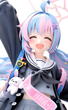 masterpiece,highres,absurdres,newest,best quality,high quality,loli,petite,chromatic_aberration,//,1girl,reisa (blue archive),solo,halo,black neckerchief,neckerchief,white sailor collar,star hair ornament,pink hair,multicolored hair,star halo,star (symbol),sailor collar,hair ornament,white background,ahoge,twintails,light blue hair,closed eyes,simple background,school uniform,v,long hair,jacket,blue hair,black jacket,open mouth,long sleeves,streaked hair,blush,open clothes,serafuku,upper body,hair beads,open jacket,pink halo,grey serafuku,smile,beads,grey shirt,hair scrunchie,shirt,arm up,low twintails,bag,backpack,fang,two-tone hair,hair between eyes,facing viewer,skin fang,scrunchie,purple hair,skirt,//,//,<lora:pvc666——【noob】hans:1>,