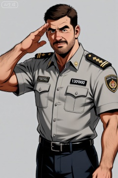 tgywl wore a tattered and torn police uniform, with two vertical stripes on his shoulders indicating the rank of Senior Superintendent. A numerical badge "130900" was affixed above the right chest pocket, while a regional police badge adorned the left chest pocket. The uniform pockets were covered with flaps and fastened with buttons, and a black belt with a rectangular buckle was fastened around his waist. He saluted with his right hand, his hand lines crisp and clean, with short, sharp hair. His face bore a small beard and mustache, his expression stern and his brows furrowed.
