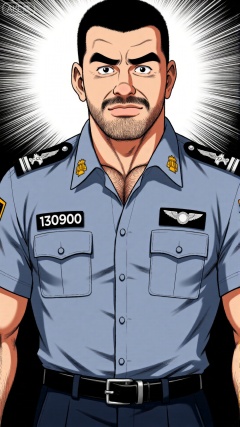 This is a cartoon style character painting, in which a man is dressed in police uniform and has a highly tense face: under thick black eyebrows are wide open eyes, exuding authority and alertness, with thick and distinct beard that spreads from the chin to the cheeks, and a serious expression. His police uniform is rich in details, with the number "130900" on his left chest, a black and white checkered shoulder patch, a badge pattern on his left arm, and a wing shaped badge on his chest; Under the police uniform, chest hair can be faintly seen, and the arm muscles are well-developed with thick hair. The black belt is tightly wrapped around the waist, making the figure even more robust. The background is reinforced with radial lines to enhance visual impact, and the contrast between pure white and pure black gives the characters a strong sense of oppression. The overall style is a typical tough guy comic technique, conveying the sense of power and justice of a "majestic police officer" through exaggerated muscle shaping, delicate clothing textures, and strong light and shadow contrast. This type of image is commonly seen in male oriented police and gangster themed comics, and is an artistic expression of power and authority.