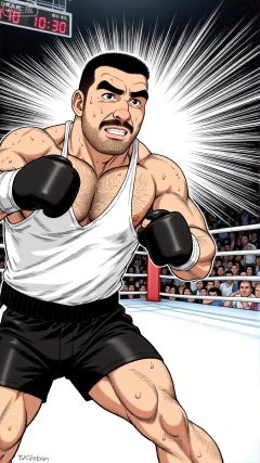This is a cartoon about boxing. The muscular boxer is wearing a white vest, black boxing shorts, and black boxing gloves. His face and back are covered with sweat beads. He has short hair and a thick beard. His expression is resolute and fierce. The picture is set in a boxing ring, with ropes and ring pillars visible. The background shows "170:10:30" The scoreboard and the crowd in the audience hall with the same words restore the intense competitive atmosphere of a boxing match. The work uses fine lines to depict the details of muscle texture and sweat beads, and uses radial lines to enhance the impact of the punch. It is a typical expression method of tough guy comics. It is often used in the creation of boxing-themed male cartoons. It uses exaggerated dynamics and detailed light and shadow to convey the sense of power and competitive tension of boxing.