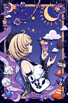 1girl,::,__artist__,year 2024,(drop shadow:1.4),(close-up:0.8),(shadow:1.2),(hands up:1.2),(border:1.2),(outside border:1.2),(hand up:1.2),(character name:1.2),from side,hand up,closed mouth,upper body,high contrast,holding cup,frown,looking at another,looking at viewer,rope,portrait,drop shadow,sparkle,^ ^,flag,moon,bug,notice lines,cloud,spider,traffic cone,star \(symbol\),circle,silk,traffic light,arrow \(symbol\),spider web,purple theme,sun,cube,crescent moon,flower,sunlight,colorful,very awa,masterpiece,best quality,newest,highres,absurdres,chibi octopus,<lora:Yidhari-will-Tanger:0.9>,Yidhari Murphy \(Zenless Zone Zero\),clothes: Yidharidef corset,Yidharidef Tentacle-like tail,Yidharidef single black garter,Yidharidef detached sleeves,Yidharidef Beret,1girl,breasts,blonde hair,black headwear,torn right single thighhigh,short hair,black footwear,high heels,ahoge,tentacles,garter straps,bangs,