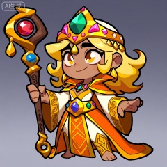 CMB,该图像描绘了一个异域风格的角色,眼神灵动,其特点是大而明亮的眼睛和微微上扬的嘴角,带着一抹神秘的微笑。角色一头金黄色的卷发,随意地披散在肩膀上,几缕发丝在微风中轻轻飘动。该角色戴着华丽的彩色头饰,顶部是一颗巨大的绿色宝石,周围点缀着粉色和黄色的水晶,头饰边缘有金色的流苏垂下。该角色穿着传统的橙色和金色搭配的服装。外袍为橙色,带有金色的滚边,内衣为金色,绣有橙色的几何图案。一条宽大的金色腰带,上面镶嵌着多颗彩色宝石,将长袍系在腰间。这套服装的袖口和下摆处都有复杂的金色花纹,从手腕一直延伸到脚踝。该角色的每只手都握着一根带有金色装饰的魔法权杖,权杖顶端是一颗红色的水晶球,权杖中部镶嵌着蓝色和绿色的宝石。这些权杖有棕色的握柄,握柄上刻有神秘的符文,权杖底部有一个小小的金色圆环。角色的手臂优雅地弯曲,举起权杖,散发出一种神秘而高贵的气息。整体设计融合了异域元素和传统美学,突出鲜艳的色彩和华丽的细节。