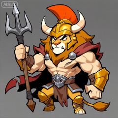 CMB,该图像描绘了一个肌肉贲张、拟人化的雄狮角色,其姿态尽显霸气、极具压迫感。雄狮身形魁梧壮硕,手臂与胸膛肌肉隆起、线条刚硬。它戴着一顶金黄色的鬃毛状头盔,将头部和耳朵完全覆盖,仅露出炯炯有神的眼睛和鼻子。鼻子呈橙红色,如同真实的狮子一般,有两个小巧的鼻孔,神情坚毅果决。雄狮的眼睛狭长且锐利,透露出愤怒与随时准备战斗的狠劲。它有一对巨大且弯曲的鬃毛状尖角从头盔顶端向外伸展。该角色身着一件破旧却威风凛凛的暗红色披风,随意地披挂在肩膀和后背,更增添了其王者般的威严气场。雄狮的右手紧握着一把巨大的三叉戟,木质的戟柄搭配着闪烁寒光的银色戟刃。左臂弯曲成拳,整个角色好似已经严阵以待,随时准备投入激烈的战斗。雄狮的服装包含金黄色裤子、棕色皮革样绑带以及大腿上的厚重盔甲。腰带上镶嵌着一个形似王冠的银色徽章,为其整体形象增添了一抹尊贵与不凡。整体风格卡通且风格化,线条粗犷豪放,色调简洁明快,赋予角色一种强烈且令人过目难忘的视觉冲击。