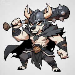 CMB,该图像描绘了一个身形矫健、拟人化的狼王角色,其姿态灵动且充满攻击性。狼王体格健壮,手臂和胸部的肌肉线条流畅而紧实。它戴着一顶深灰色的狼耳状头盔,将头部和耳朵包裹其中,只露出锐利的眼睛和鼻子。鼻子呈黑色,有两个小巧的鼻孔,表情冷峻坚毅。狼王的眼睛狭长而凶狠,仿佛燃烧着战斗的火焰,给人一种随时准备出击的紧张感。它有一对巨大且弯曲的狼牙状尖角从头盔两侧向上伸出。该角色身着一件破破烂烂的黑色斗篷,随意地搭在肩膀和背部,更凸显出其不羁与野性。狼王的右手挥舞着一把巨大的狼牙棒,木质的棒身搭配着布满尖刺的银色棒头。左臂握成坚实的拳头,角色已然做好了战斗的充分准备。狼王的服装包括深灰色裤子、黑色皮革样绑带以及大腿上的轻便盔甲。腰带上有一个类似狼头图案的青铜色徽章,为其外观增添了一丝神秘与威严。整体风格卡通化、风格化,线条大胆奔放,色调沉稳内敛,赋予角色一种强烈且极具辨识度的外观形象。