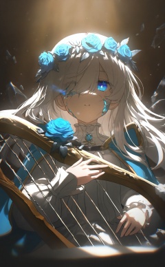 masterpiece,highres,absurdres,newest,best quality,high quality,loli,petite,chromatic_aberration,//, 1girl, solo, long hair, looking at viewer, blue eyes, hair ornament, dress, holding, jewelry, flower, white hair, frills, parted lips, cape, white dress,, rose,, instrument, blue flower, head wreath, playing instrument, holding instrument, harp, hair over eye,cracked screen centered around the eyes, cracked lens centered around the eyes, splatted glass fragments centered around the eyes, volumetric light and shadow, light particles, light rays, shadow, cinematic lighting, backlighting, glowing eye, solo, portrait, cold face, expressionless ruins, volumetric light and shadow, best light and shadow, {cinematic lighting,cracked face,crack,broken face//,<lora:konya_karasue2——【noob】hans:0.8>,