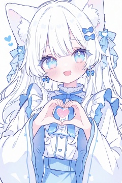 1girl, heart, heart hands, solo, animal ears, blue eyes, white hair, long hair, smile, blush, long sleeves, looking at viewer, jewelry, open mouth, animal ear fluff, earrings, upper body, simple background, frills, hair ornament, cat ears, white background, shirt, white shirt, blue bow, bow, wide sleeves, dress, :d