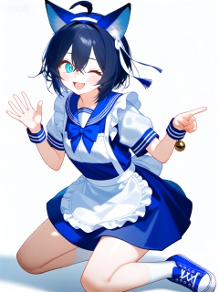 WHT,该图像描绘了一个穿着蓝白水手服的动漫风格角色。她有一头深蓝色短发,在头顶扎成一个小揪揪,用一条蓝色发带固定,发带下方垂着一条带有流苏的白色头带。她的头发两侧有几缕细长的发丝。她有一双清澈的湖蓝色眼睛,目光明亮,嘴角带着灿烂的笑容,左眼俏皮地眨动。她的头上戴着蓝色的狐狸耳朵发饰,耳朵内侧是浅蓝色的。她的服装包括一件蓝色短裙,搭配一条带有波浪边的白色围裙,腰间有一个蓝色大蝴蝶结。她裙子的袖子是短袖,白色的,袖口是蓝色的,袖口处有一个小铃铛。她还戴着白色手腕绑带,两只手腕上都有蓝色条纹装饰。她的姿势充满动感:她半蹲在地上,左腿弯曲,右腿向后伸展。左手向上举起,手掌张开,右手向前伸出,手指指向一侧。她穿着白色短袜和蓝色帆布鞋,鞋面上有白色条纹。背景是纯白色的,使得人物格外突出显眼。