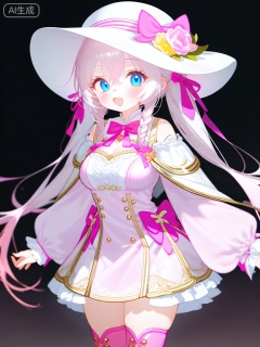 WHT,这张图片描绘了一个动漫风格的女性角色,有着淡粉色的长发和明亮的蓝色眼睛。她戴着一顶白色的宽边帽,上面装饰着一个粉色的蝴蝶结,边上有一朵粉色和黄色的花。她的头发用粉色丝带扎成双马尾辫。她有一张甜美的脸,脸颊上有可爱的酒窝,给人一种活泼开朗的表情。她的服装包括一件浅粉色长袖连衣裙,上面有精致的白色和金色蕾丝和装饰性蝴蝶结,连衣裙搭配有白色和金色点缀的粉色短靴。一件金色镶边的白色小披肩搭在她的肩膀上,在她身后微微飘动。她的服装整体设计优雅而可爱,融合了甜美和幻想的元素。