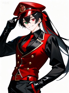 WHT,动漫风格男性角色的详细全彩插图。他有一头墨黑色的长发,用红色丝带扎成高马尾辫。他的眼睛很大,呈异色,左眼呈深绿色,右眼呈暗红色。他戴着一顶红色皮质帽子,上面有金色徽章和红色丝带。他的表情很自信,嘴角上扬,像是在展示自己的风采,脸颊线条刚毅。他穿着红黑相间的制服,包括带有金色纽扣的紧身马甲、带有分层黑色和红色褶边的长裤以及带有红色领子的短袖衬衫。他还戴着黑色皮手套,腰间系着红色腰带。背景是纯白色的,使他成为图像的焦点。整体风格充满活力和力量感,重点是他富有魅力的特征和硬朗的服装设计。