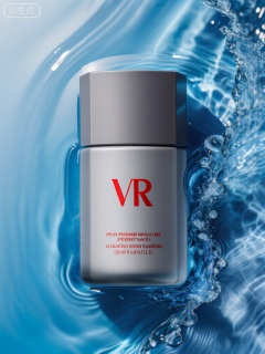 SZCJ,该图像呈现了一个精致的哑光灰色长方体容器和配套的灰色盖子。容器采用现代简约风格,边角圆润。容器正面有红色文字,其中包含大号粗体字母“VR”,后面是较小的文字,似乎是英文和西班牙文的品牌标识和产品特色。容器部分浸没在闪烁的蓝色液体中,液体在容器周围荡漾和飞溅,营造出一种梦幻感和活力感。该液体具有晶莹、透亮的表面,可以反射光线,增强图像的奇幻和充满生机的氛围。整体构图在视觉上十分吸睛,灰色容器与明亮、灵动的液体色调形成强烈对比。