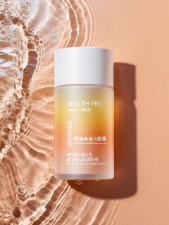 SZCJ,该图像展示了一个圆柱形保健品瓶直立在反光、波纹状的水面上。瓶子采用渐变配色方案,从底部的浅橙色过渡到顶部的淡黄色,几乎透明。瓶盖为实心哑光白色。 瓶子正面有白色文字,上面写着“HEALTH PRO”和靠近顶部的“since 2020”。下面,有几行汉字和英文的文字。英文文本包括“增强免疫力胶囊”和“调节内分泌片剂”等短语。中文字符垂直和水平放置在英文文本周围。 背景为浅橙色,与瓶子的渐变颜色相呼应,营造出和谐温暖的视觉效果。水面有波纹和小气泡,给图像增添了动感和活力。灯光将瓶子的柔和阴影投射到右侧水面上,增强了瓶子的三维外观。整体构图干净而现代,重点关注产品的品牌和水背景所暗示的健康主题。