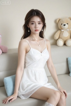 1girl, solo, looking at viewer, brown hair, brown eyes, jewelry, earrings, lips, dress, brown eyes, jewelry, sitting, socks, indoors, necklace, stuffed toy, stuffed animal, couch, realistic, (masterpiece, best quality, ultra high res, 8k, uhd, absurdres),photorealistic (realistic skin texture, subtle skin details, natural skin reflection, healthy skin tone, unretouched look, matte skin),DSLR style,aesthetic,highly detailed (detailed anatomy),