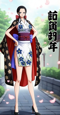 Nico Robin one piece, Nico Robin \(one piece\), nico robin, 1girl, solo, black hair, japanese clothes, kimono, full body, looking at viewer, hand on own hip, floral print, sleeveless kimono, sash, long hair, sleeveless, bow, standing, blue eyes, hair bow, smile, breasts, petals, red bow, black footwear, high heels, ribbon,