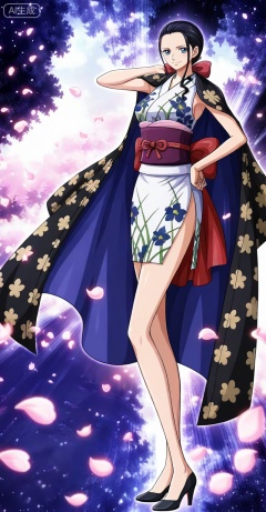 Nico Robin one piece, Nico Robin \(one piece\), nico robin, 1girl, solo, black hair, japanese clothes, kimono, full body, looking at viewer, hand on own hip, floral print, sleeveless kimono, sash, long hair, sleeveless, bow, standing, blue eyes, hair bow, smile, breasts, petals, red bow, black footwear, high heels, ribbon,